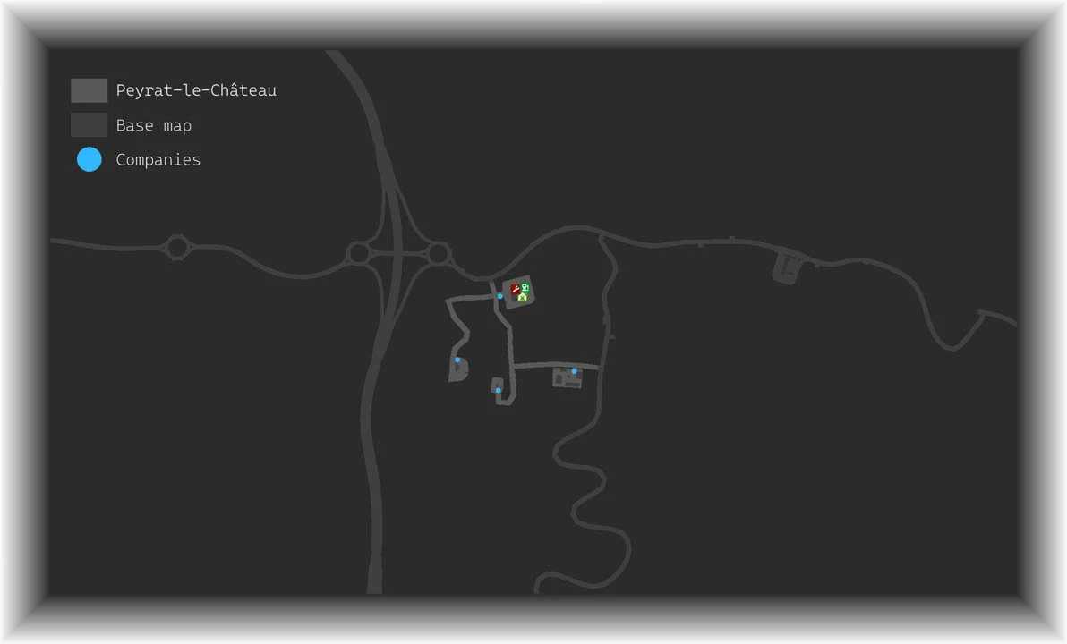 Peyrat-le-Château is a quaint town situated close to Limoges, France. Within the base game, it exists merely as a decorative element with no companies or map representation. This mod introduces functional and accessible companies, offering job opportunities. Players can also find a customized garage that can be purchased, enhancing the gameplay experience.